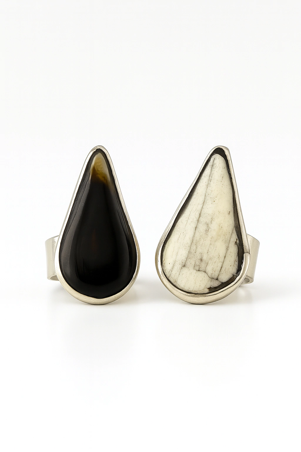 Anillo fabricado en alpaca y hasta de ciervo todos regulables con distintos formatos cada piedra es única por lo que nunca hay dos anillos iguales así que puede tocarte una piedra más marrón o una piedra más negra o una piedra más blanca lo que puede elegir es el formato de la piedra qué quieren