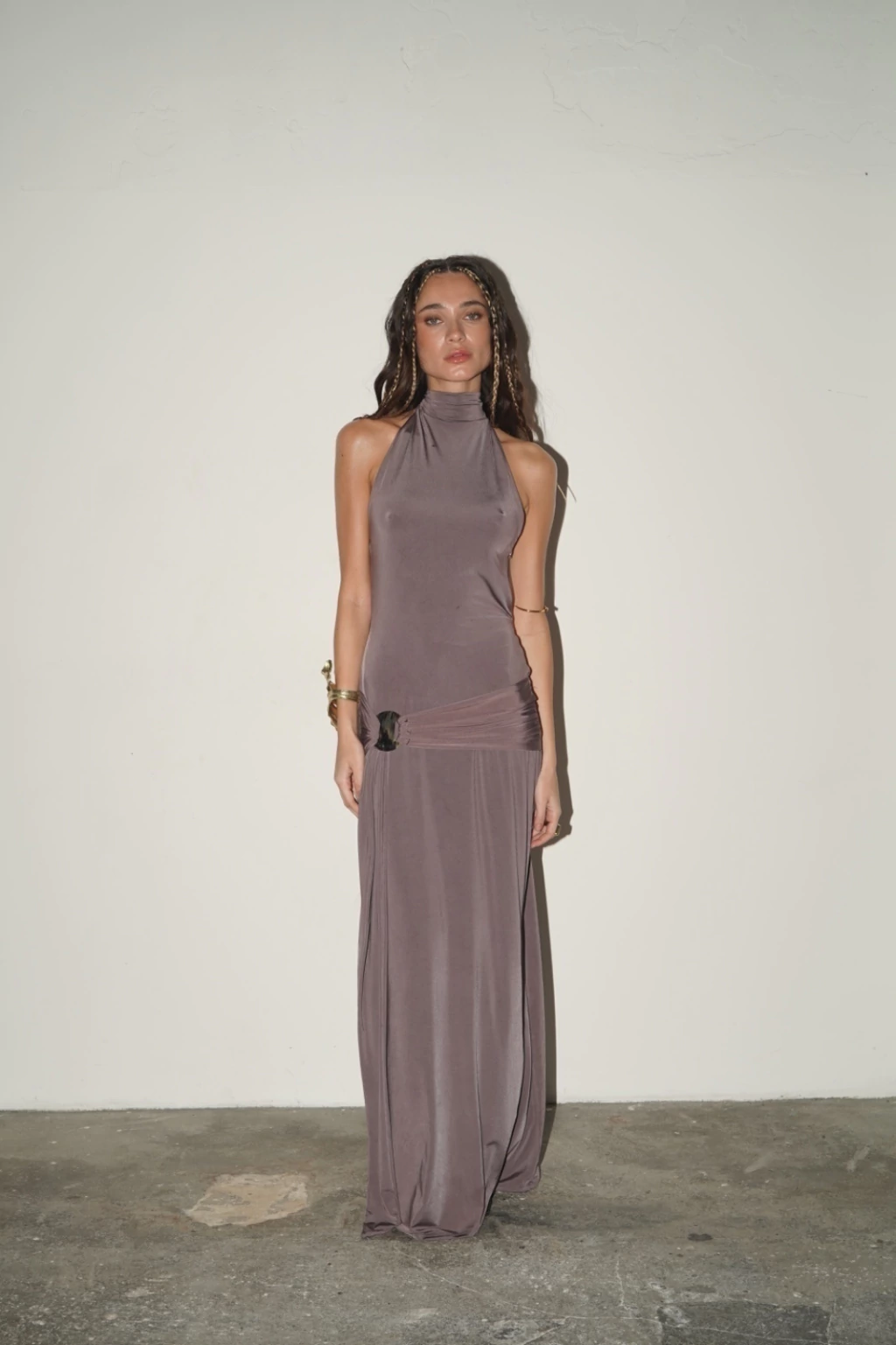 Descripción vestido de seda fría elastizado con lazo regulable en cadera con dije pasante de cuerno de vaca tipo nácar cuello con lazo regulable y tira en espalda desmontable